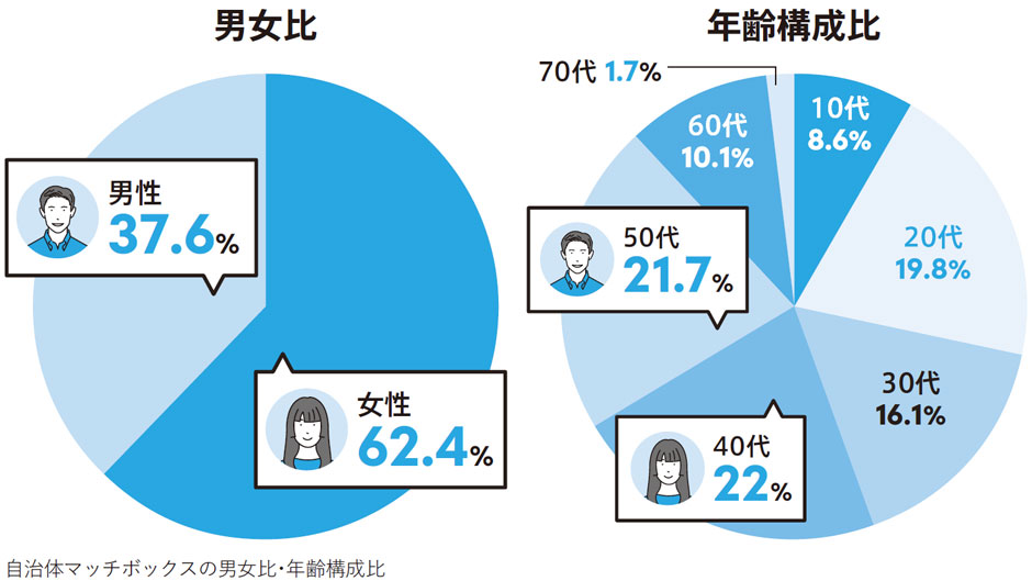 実際に、私たちのサービスの登録者データを見ると、他の民間サービスが10代~30代で6割以上を占めるのに対し、「自治体マッチボックス」では40代、50代が全体の約44%を占め、その多くが女性という特徴的な構成になっています。自治体が主体となることで、これまで労働市場に出てきづらかった層にアプローチでき、本当の意味での労働力の掘り起こしが可能になると確信しています。